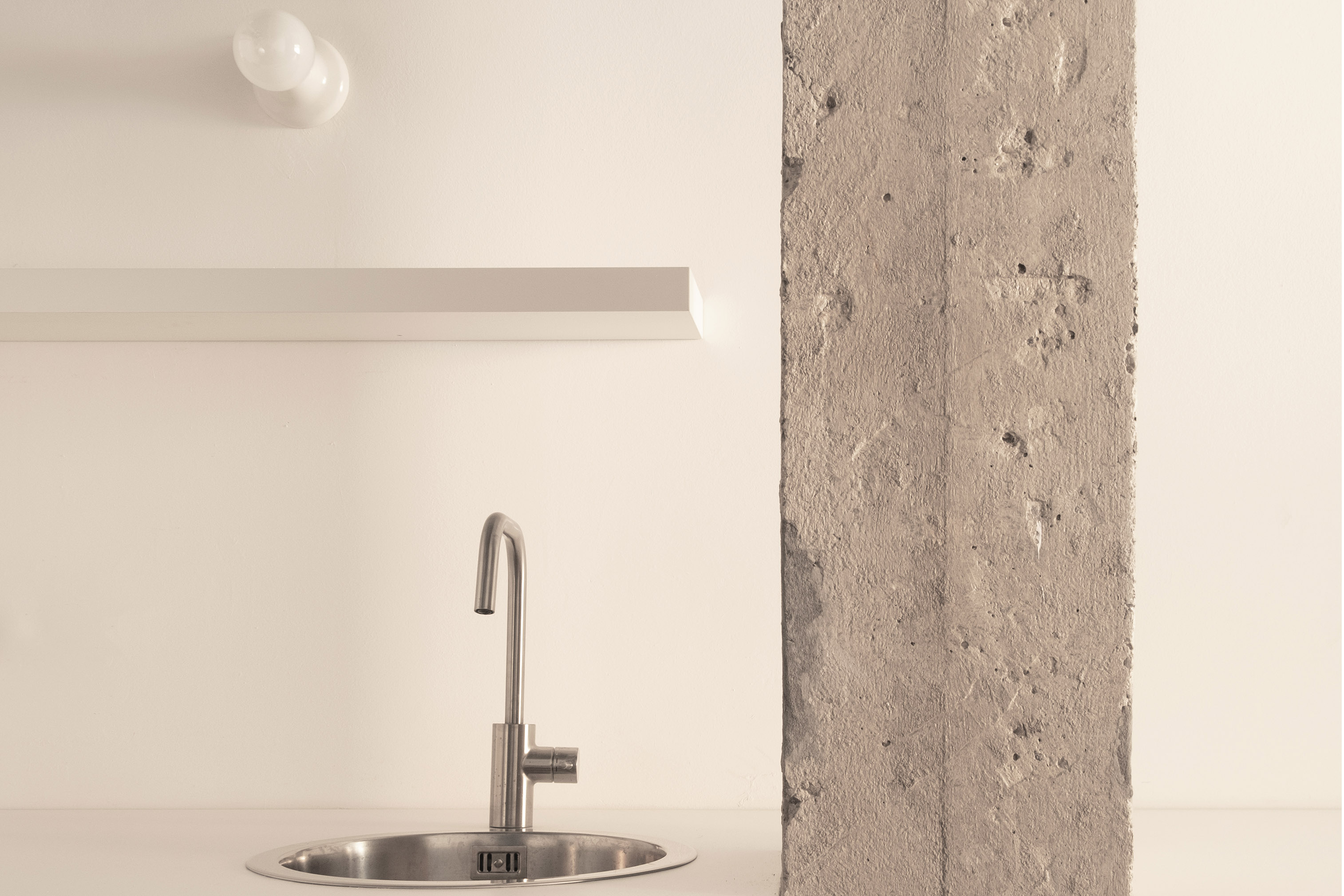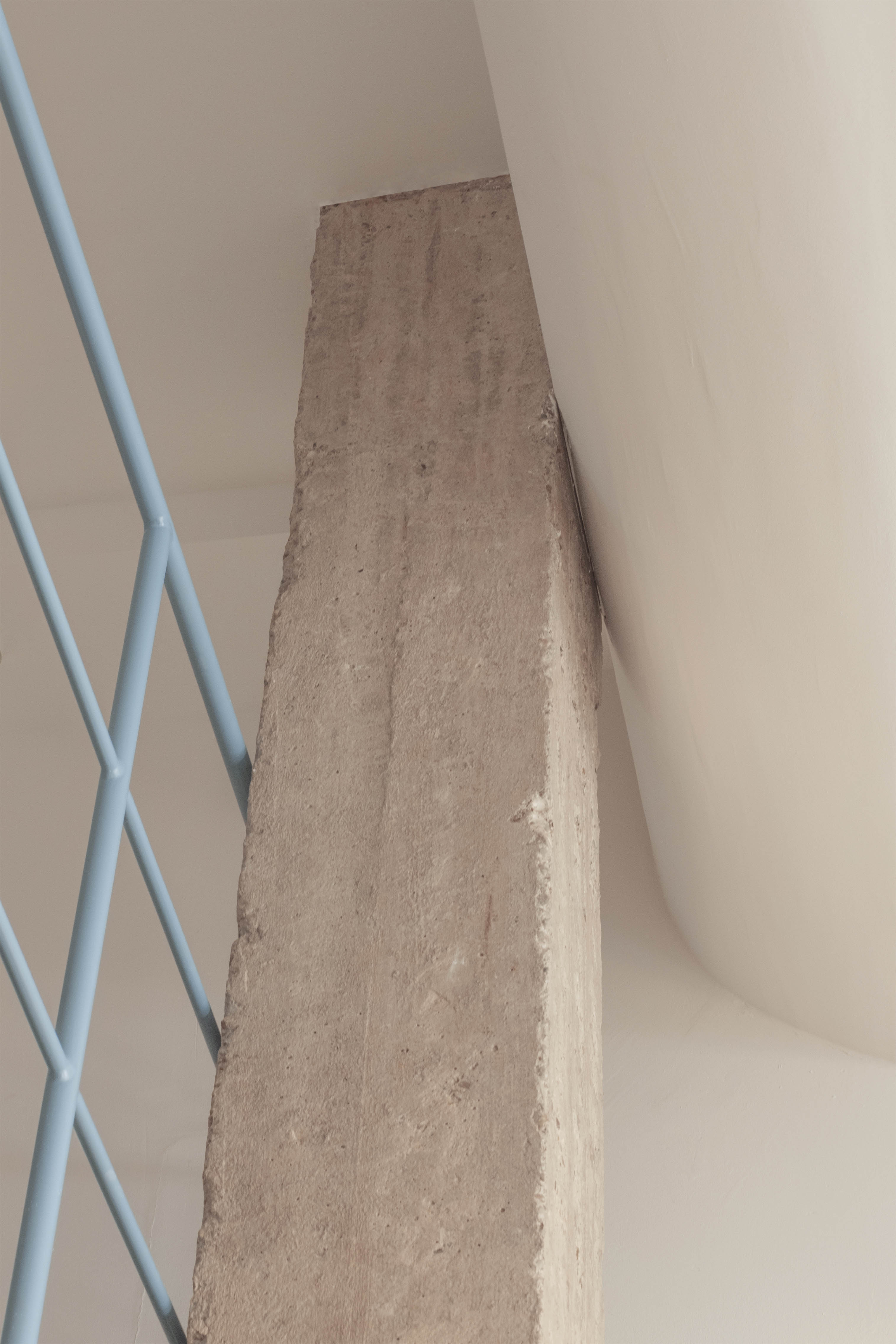. Protruding column. Extension of upper level with metal grates. Custom-made kitchen.